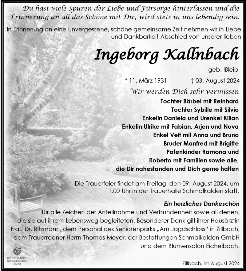Hier finden Sie alle Traueranzeigen aus der Zeitung, die bisher für Ingeborg Kallnbach erschienen sind. Weitere Traueranzeigen, die in der Zeitung erscheinen, werden hier ebenfalls aufgelistet
