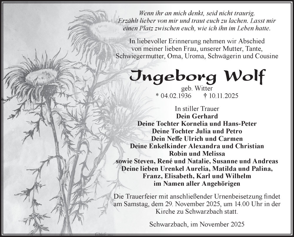 Hier finden Sie alle Traueranzeigen aus der Zeitung, die bisher für Ingeborg Wolf erschienen sind. Weitere Traueranzeigen, die in der Zeitung erscheinen, werden hier ebenfalls aufgelistet