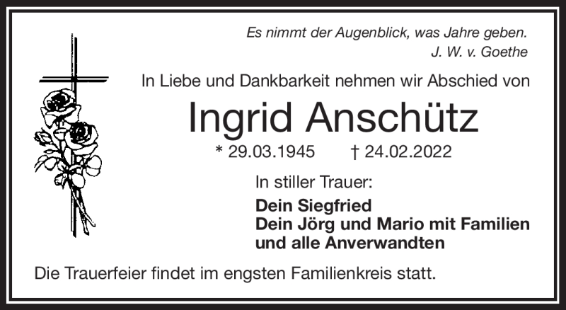 Hier finden Sie alle Traueranzeigen aus der Zeitung, die bisher für Ingrid Anschütz erschienen sind. Weitere Traueranzeigen, die in der Zeitung erscheinen, werden hier ebenfalls aufgelistet