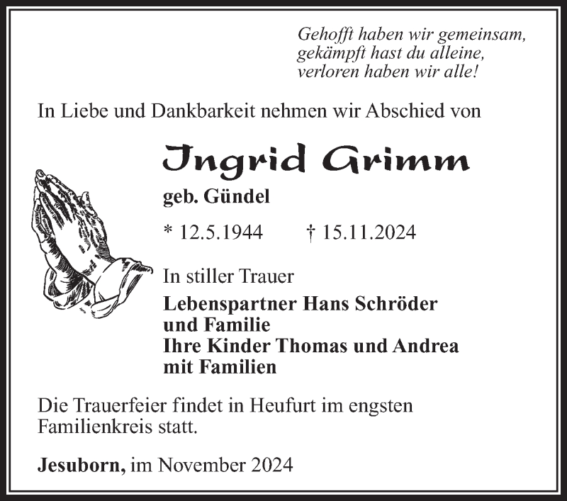 Hier finden Sie alle Traueranzeigen aus der Zeitung, die bisher für Ingrid Grimm erschienen sind. Weitere Traueranzeigen, die in der Zeitung erscheinen, werden hier ebenfalls aufgelistet