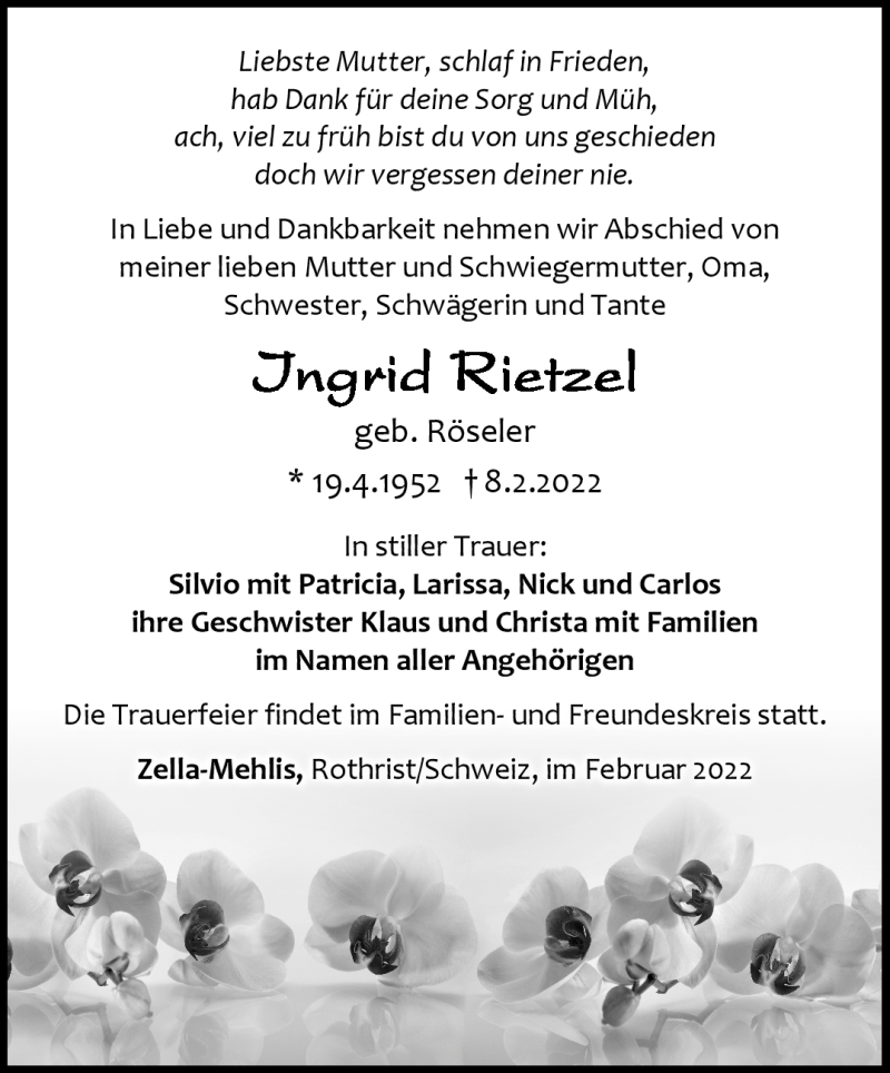 Hier finden Sie alle Traueranzeigen aus der Zeitung, die bisher für Ingrid Rietzel erschienen sind. Weitere Traueranzeigen, die in der Zeitung erscheinen, werden hier ebenfalls aufgelistet