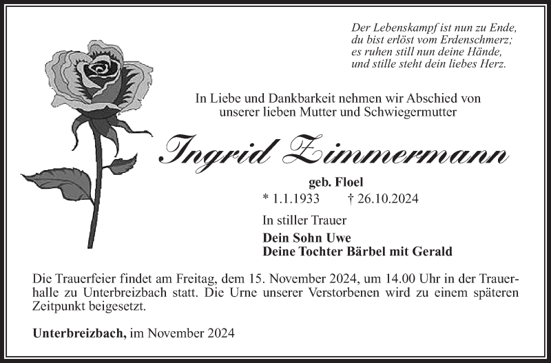 Hier finden Sie alle Traueranzeigen aus der Zeitung, die bisher für Ingrid Zimmermann erschienen sind. Weitere Traueranzeigen, die in der Zeitung erscheinen, werden hier ebenfalls aufgelistet
