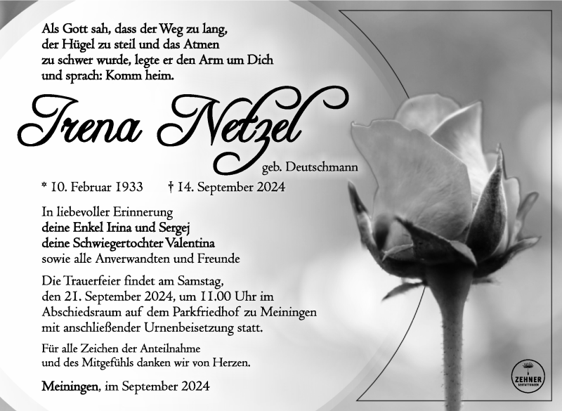 Hier finden Sie alle Traueranzeigen aus der Zeitung, die bisher für Irena Netzel erschienen sind. Weitere Traueranzeigen, die in der Zeitung erscheinen, werden hier ebenfalls aufgelistet