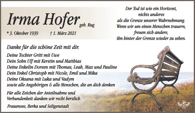 Hier finden Sie alle Traueranzeigen aus der Zeitung, die bisher für Irma Hofer erschienen sind. Weitere Traueranzeigen, die in der Zeitung erscheinen, werden hier ebenfalls aufgelistet