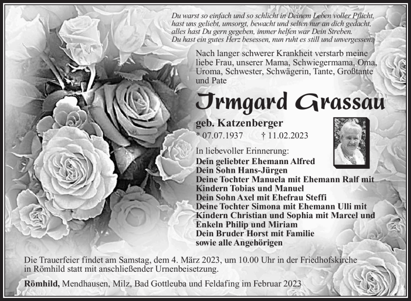 Hier finden Sie alle Traueranzeigen aus der Zeitung, die bisher für Irmgard Grassau erschienen sind. Weitere Traueranzeigen, die in der Zeitung erscheinen, werden hier ebenfalls aufgelistet