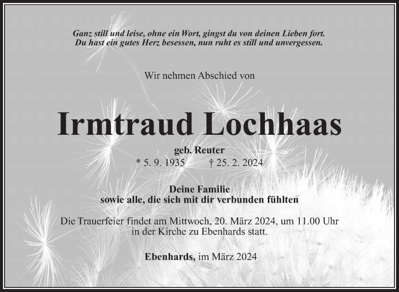 Hier finden Sie alle Traueranzeigen aus der Zeitung, die bisher für Irmtraud Lochhaas erschienen sind. Weitere Traueranzeigen, die in der Zeitung erscheinen, werden hier ebenfalls aufgelistet