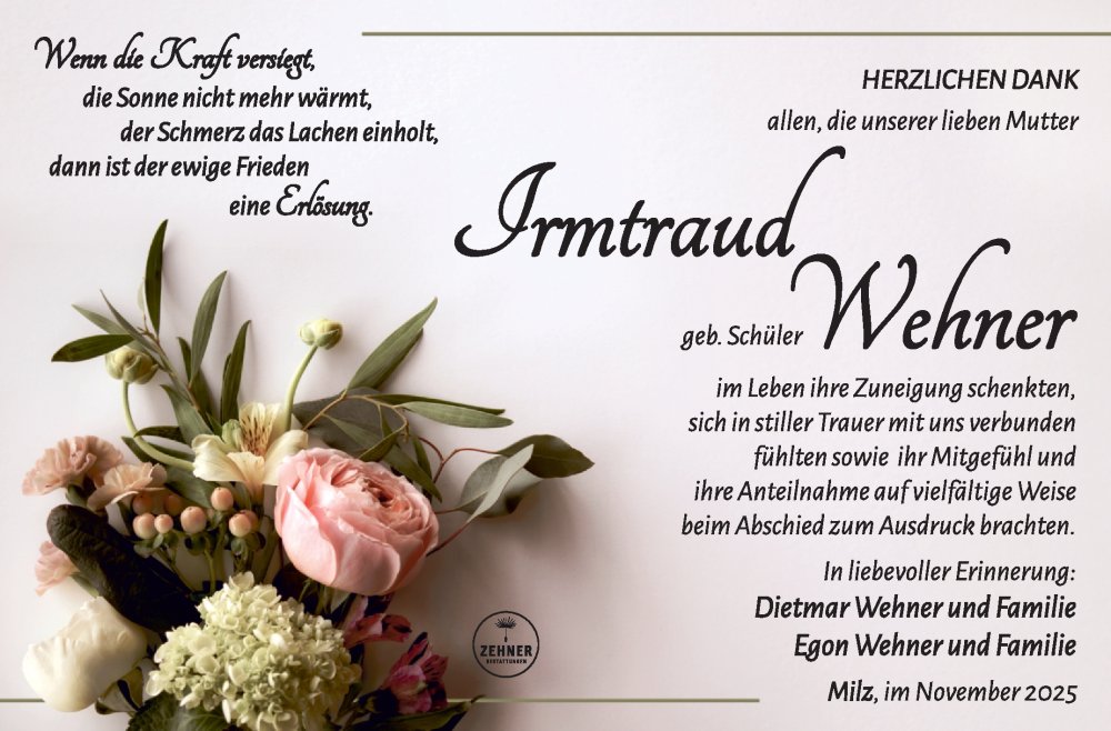 Hier finden Sie alle Traueranzeigen aus der Zeitung, die bisher für Irmtraud Wehner erschienen sind. Weitere Traueranzeigen, die in der Zeitung erscheinen, werden hier ebenfalls aufgelistet