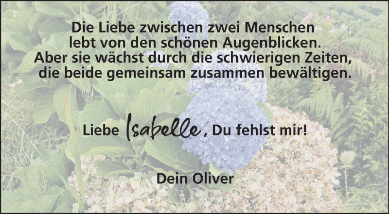 Hier finden Sie alle Traueranzeigen aus der Zeitung, die bisher für Isabelle Koch erschienen sind. Weitere Traueranzeigen, die in der Zeitung erscheinen, werden hier ebenfalls aufgelistet