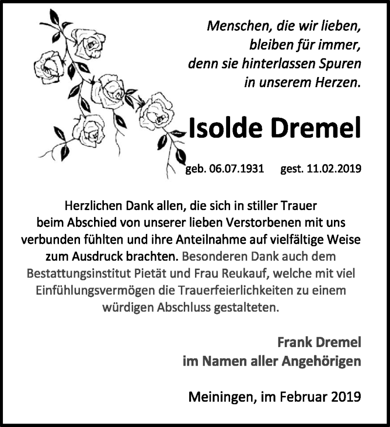 Hier finden Sie alle Traueranzeigen aus der Zeitung, die bisher für Isolde Dremel erschienen sind. Weitere Traueranzeigen, die in der Zeitung erscheinen, werden hier ebenfalls aufgelistet