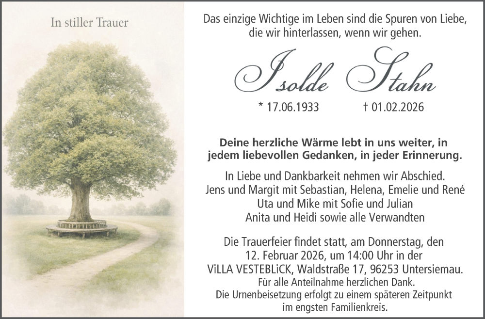 Hier finden Sie alle Traueranzeigen aus der Zeitung, die bisher für Isolde Stahn erschienen sind. Weitere Traueranzeigen, die in der Zeitung erscheinen, werden hier ebenfalls aufgelistet