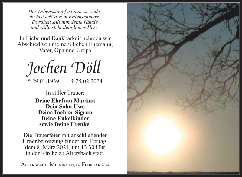 Hier finden Sie alle Traueranzeigen aus der Zeitung, die bisher für Jochen Döll erschienen sind. Weitere Traueranzeigen, die in der Zeitung erscheinen, werden hier ebenfalls aufgelistet