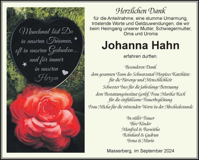 Hier finden Sie alle Traueranzeigen aus der Zeitung, die bisher für Johanna Hahn erschienen sind. Weitere Traueranzeigen, die in der Zeitung erscheinen, werden hier ebenfalls aufgelistet