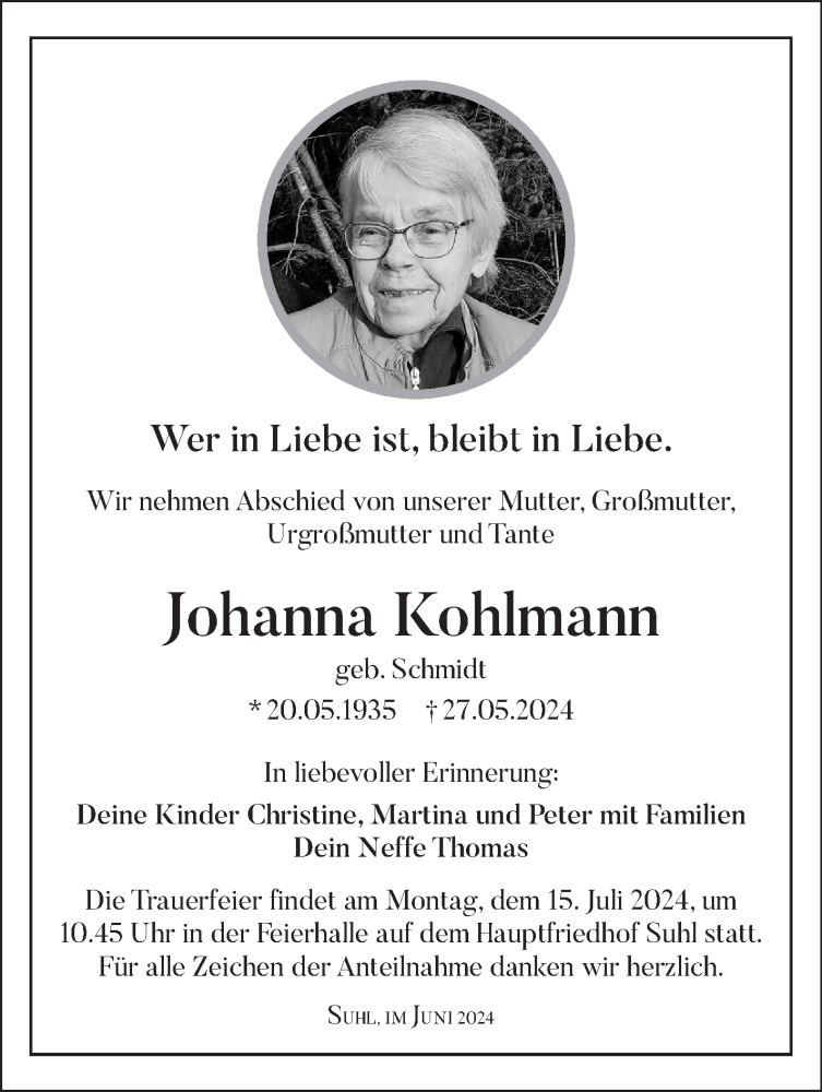 Hier finden Sie alle Traueranzeigen aus der Zeitung, die bisher für Johanna Kohlmann erschienen sind. Weitere Traueranzeigen, die in der Zeitung erscheinen, werden hier ebenfalls aufgelistet