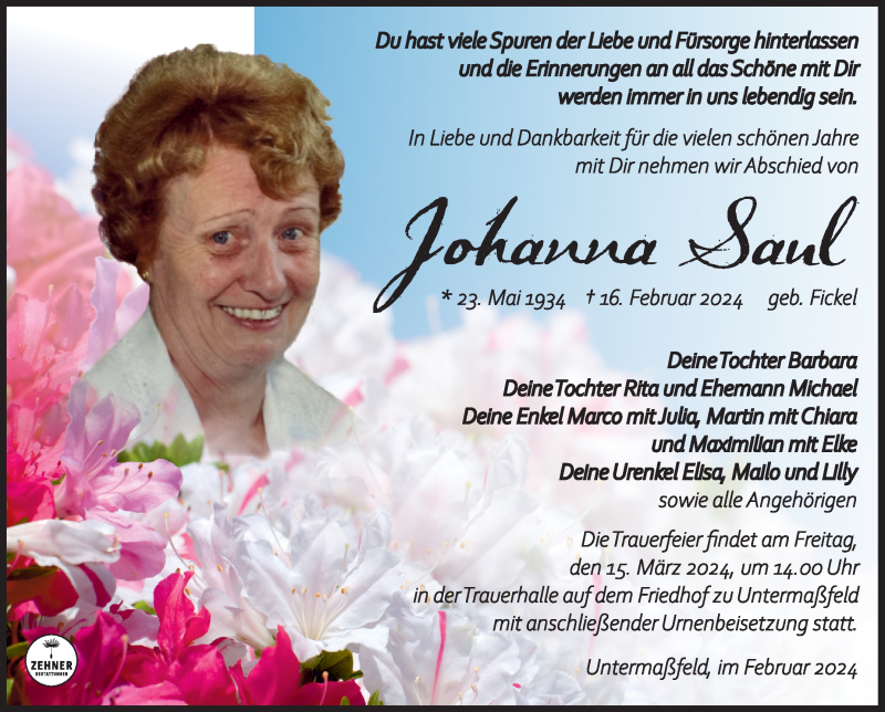 Hier finden Sie alle Traueranzeigen aus der Zeitung, die bisher für Johanna Saul erschienen sind. Weitere Traueranzeigen, die in der Zeitung erscheinen, werden hier ebenfalls aufgelistet