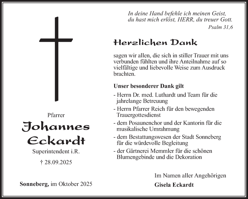 Hier finden Sie alle Traueranzeigen aus der Zeitung, die bisher für Johannes Eckardt erschienen sind. Weitere Traueranzeigen, die in der Zeitung erscheinen, werden hier ebenfalls aufgelistet