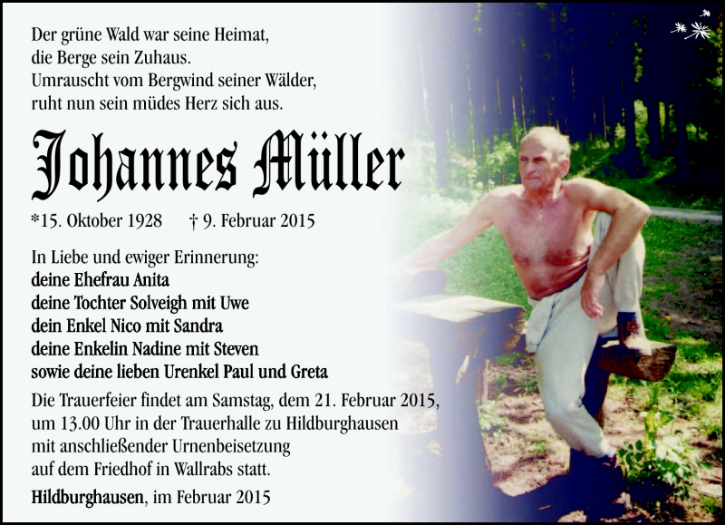 Hier finden Sie alle Traueranzeigen aus der Zeitung, die bisher für Johannes Müller erschienen sind. Weitere Traueranzeigen, die in der Zeitung erscheinen, werden hier ebenfalls aufgelistet
