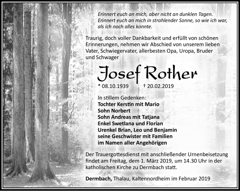 Hier finden Sie alle Traueranzeigen aus der Zeitung, die bisher für Josef Rother erschienen sind. Weitere Traueranzeigen, die in der Zeitung erscheinen, werden hier ebenfalls aufgelistet