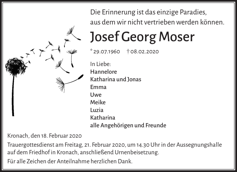 Hier finden Sie alle Traueranzeigen aus der Zeitung, die bisher für Josef Georg Moser erschienen sind. Weitere Traueranzeigen, die in der Zeitung erscheinen, werden hier ebenfalls aufgelistet