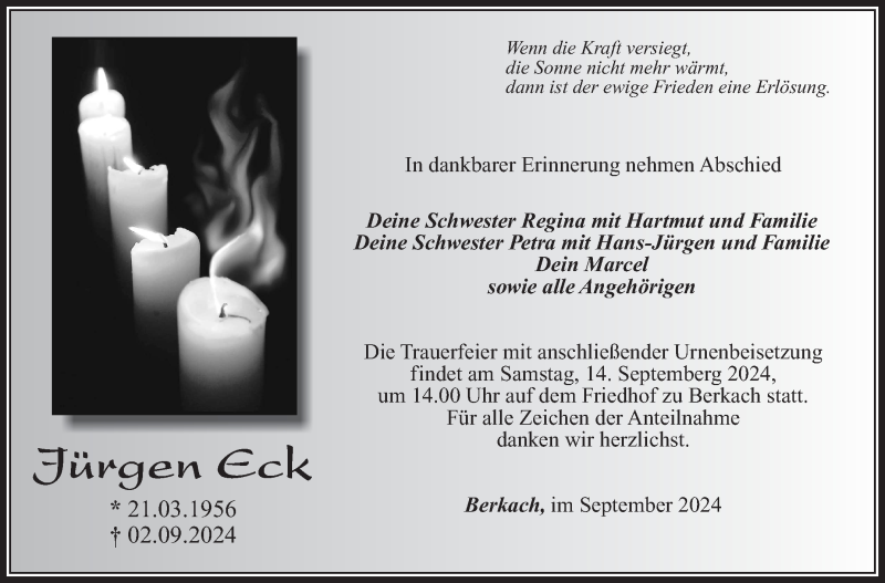 Hier finden Sie alle Traueranzeigen aus der Zeitung, die bisher für Jürgen Eck erschienen sind. Weitere Traueranzeigen, die in der Zeitung erscheinen, werden hier ebenfalls aufgelistet
