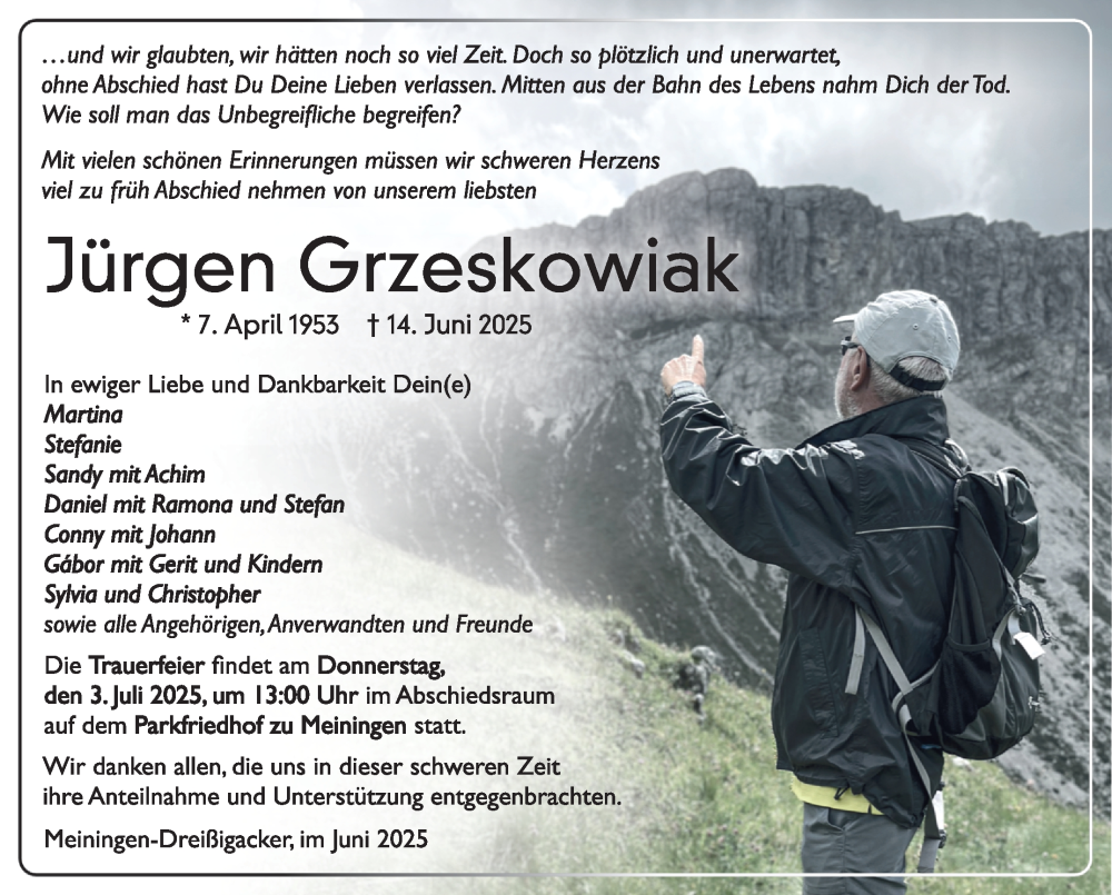 Hier finden Sie alle Traueranzeigen aus der Zeitung, die bisher für Jürgen Grzeskowaik erschienen sind. Weitere Traueranzeigen, die in der Zeitung erscheinen, werden hier ebenfalls aufgelistet