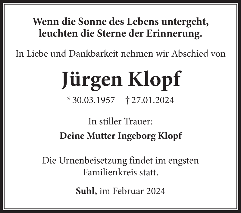 Hier finden Sie alle Traueranzeigen aus der Zeitung, die bisher für Jürgen Klopf erschienen sind. Weitere Traueranzeigen, die in der Zeitung erscheinen, werden hier ebenfalls aufgelistet