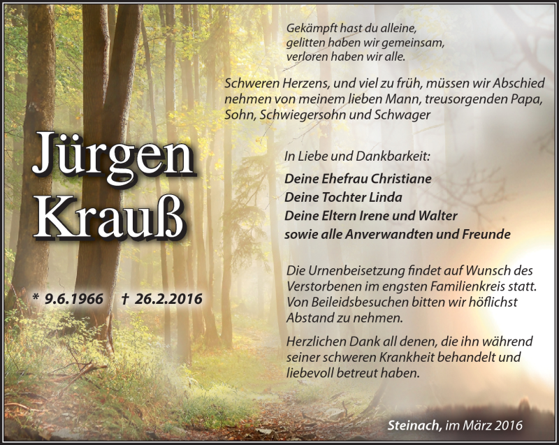 Hier finden Sie alle Traueranzeigen aus der Zeitung, die bisher für Jürgen Krauß erschienen sind. Weitere Traueranzeigen, die in der Zeitung erscheinen, werden hier ebenfalls aufgelistet