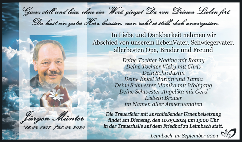 Hier finden Sie alle Traueranzeigen aus der Zeitung, die bisher für Jürgen Münter erschienen sind. Weitere Traueranzeigen, die in der Zeitung erscheinen, werden hier ebenfalls aufgelistet