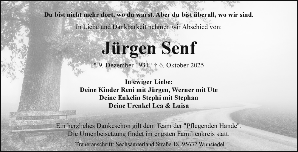 Hier finden Sie alle Traueranzeigen aus der Zeitung, die bisher für Jürgen Senf erschienen sind. Weitere Traueranzeigen, die in der Zeitung erscheinen, werden hier ebenfalls aufgelistet
