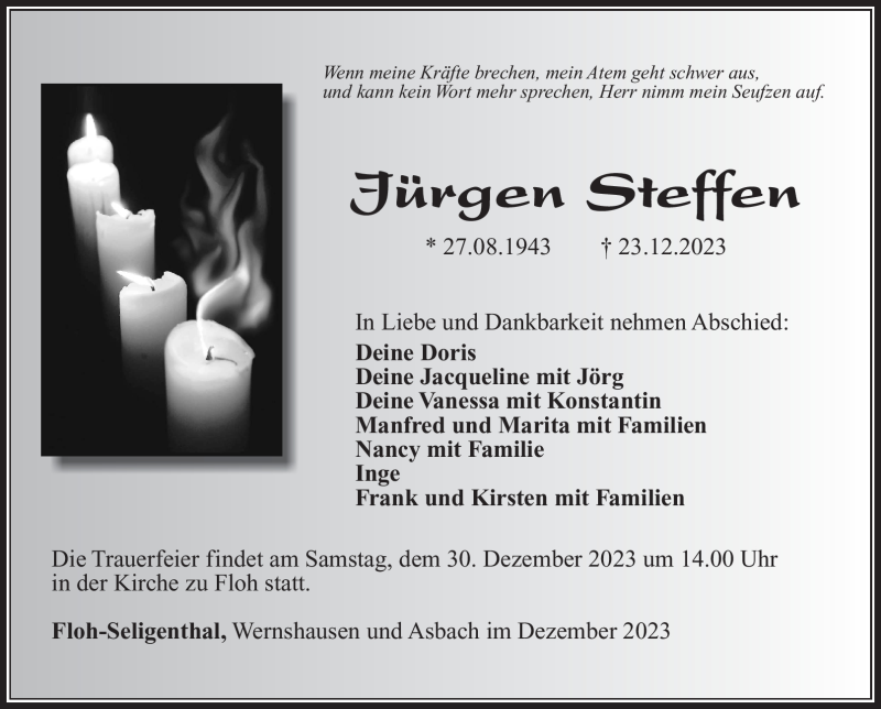 Hier finden Sie alle Traueranzeigen aus der Zeitung, die bisher für Jürgen Steffen erschienen sind. Weitere Traueranzeigen, die in der Zeitung erscheinen, werden hier ebenfalls aufgelistet