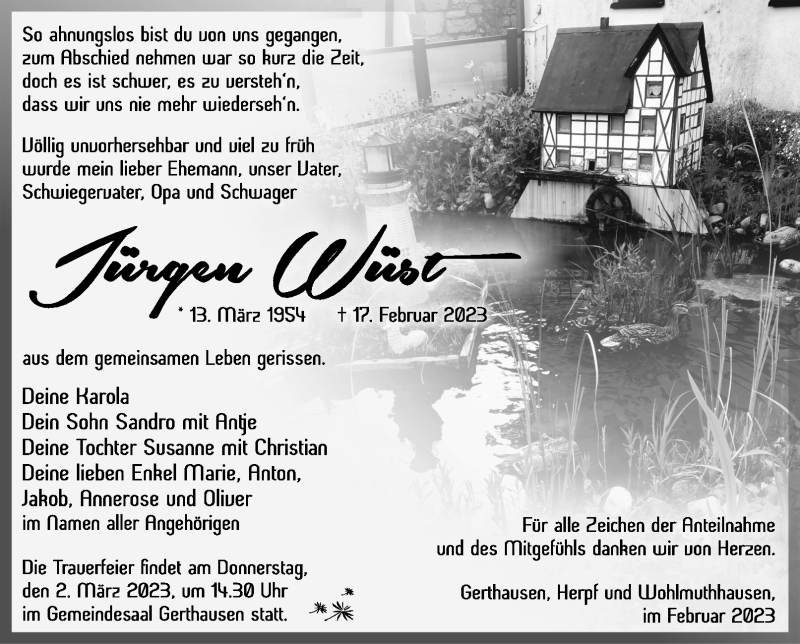 Hier finden Sie alle Traueranzeigen aus der Zeitung, die bisher für Jürgen Wüst erschienen sind. Weitere Traueranzeigen, die in der Zeitung erscheinen, werden hier ebenfalls aufgelistet