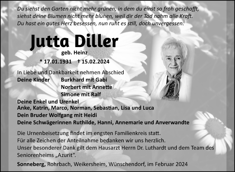 Hier finden Sie alle Traueranzeigen aus der Zeitung, die bisher für Jutta Diller erschienen sind. Weitere Traueranzeigen, die in der Zeitung erscheinen, werden hier ebenfalls aufgelistet