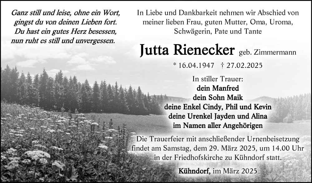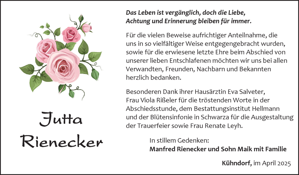 Hier finden Sie alle Traueranzeigen aus der Zeitung, die bisher für Jutta Rienecker erschienen sind. Weitere Traueranzeigen, die in der Zeitung erscheinen, werden hier ebenfalls aufgelistet