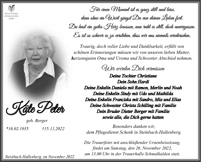 Hier finden Sie alle Traueranzeigen aus der Zeitung, die bisher für Käte Peter erschienen sind. Weitere Traueranzeigen, die in der Zeitung erscheinen, werden hier ebenfalls aufgelistet