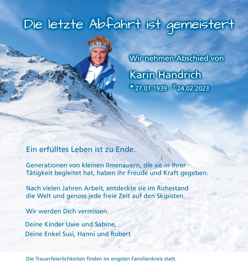Hier finden Sie alle Traueranzeigen aus der Zeitung, die bisher für Karin Handrich erschienen sind. Weitere Traueranzeigen, die in der Zeitung erscheinen, werden hier ebenfalls aufgelistet