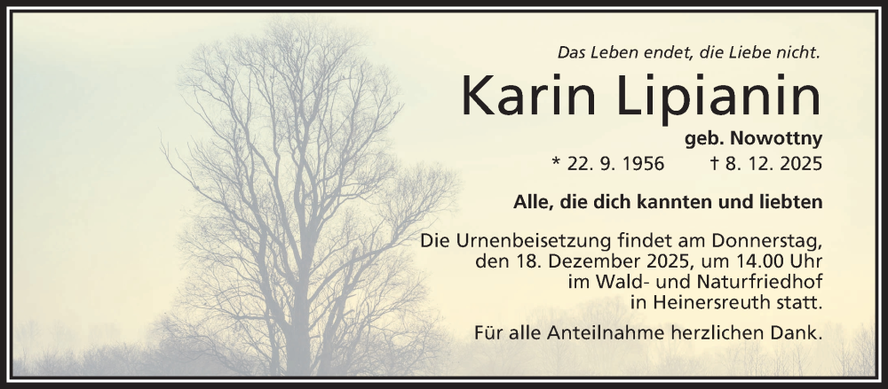 Hier finden Sie alle Traueranzeigen aus der Zeitung, die bisher für Karin Lipianin erschienen sind. Weitere Traueranzeigen, die in der Zeitung erscheinen, werden hier ebenfalls aufgelistet
