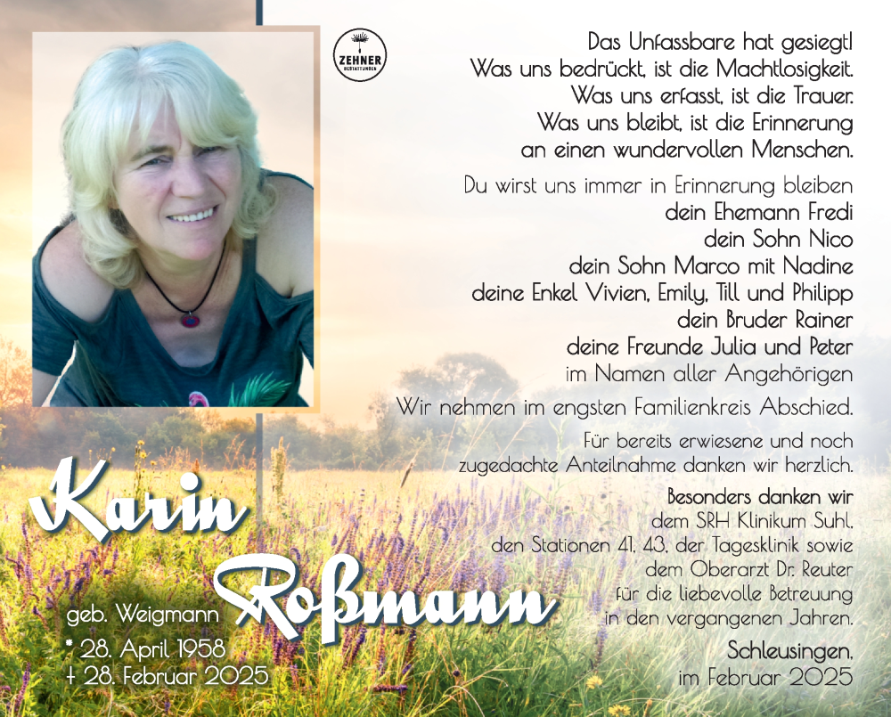 Hier finden Sie alle Traueranzeigen aus der Zeitung, die bisher für Karin Roßmann erschienen sind. Weitere Traueranzeigen, die in der Zeitung erscheinen, werden hier ebenfalls aufgelistet