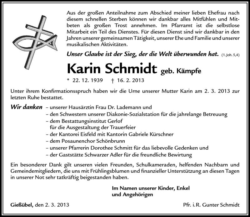 Hier finden Sie alle Traueranzeigen aus der Zeitung, die bisher für Karin Schmidt erschienen sind. Weitere Traueranzeigen, die in der Zeitung erscheinen, werden hier ebenfalls aufgelistet