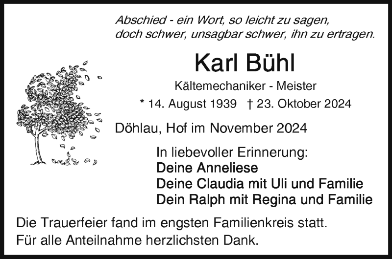 Hier finden Sie alle Traueranzeigen aus der Zeitung, die bisher für Karl Bühl erschienen sind. Weitere Traueranzeigen, die in der Zeitung erscheinen, werden hier ebenfalls aufgelistet