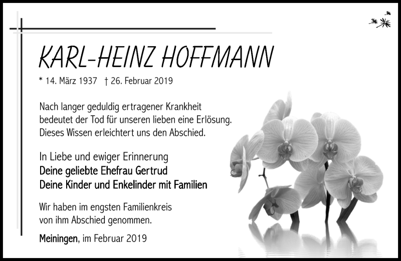Hier finden Sie alle Traueranzeigen aus der Zeitung, die bisher für Karl-Heinz Hoffmann erschienen sind. Weitere Traueranzeigen, die in der Zeitung erscheinen, werden hier ebenfalls aufgelistet