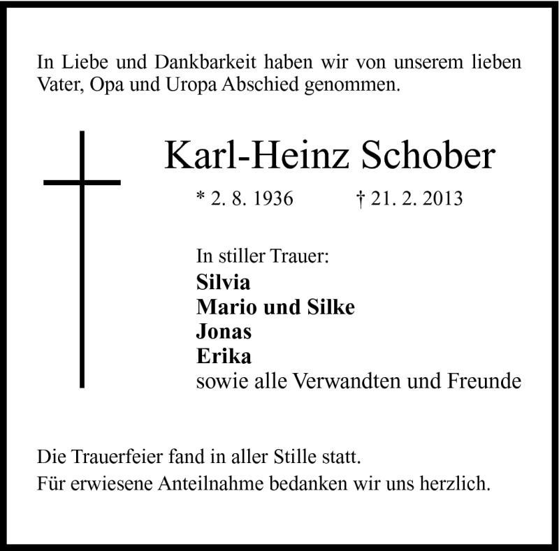 Hier finden Sie alle Traueranzeigen aus der Zeitung, die bisher für Karl-Heinz Schober erschienen sind. Weitere Traueranzeigen, die in der Zeitung erscheinen, werden hier ebenfalls aufgelistet
