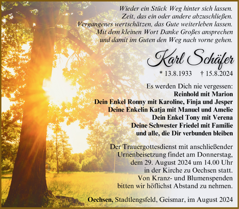 Hier finden Sie alle Traueranzeigen aus der Zeitung, die bisher für Karl Schäfer erschienen sind. Weitere Traueranzeigen, die in der Zeitung erscheinen, werden hier ebenfalls aufgelistet