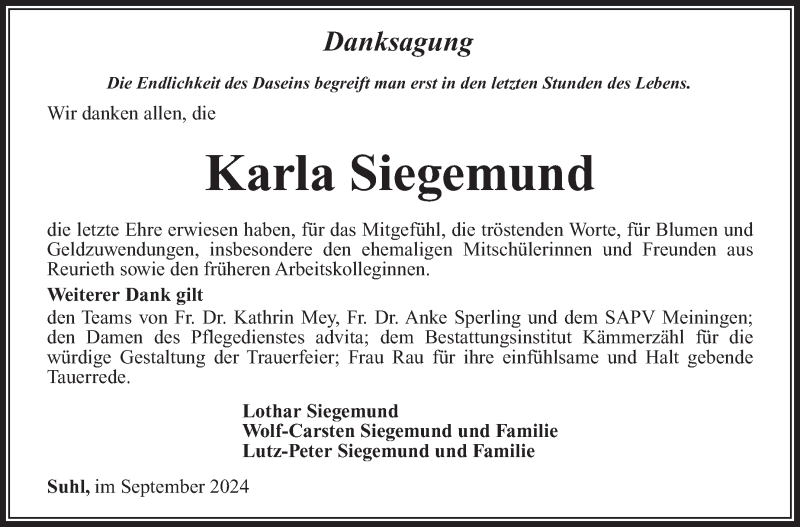 Hier finden Sie alle Traueranzeigen aus der Zeitung, die bisher für Karla Siegemund erschienen sind. Weitere Traueranzeigen, die in der Zeitung erscheinen, werden hier ebenfalls aufgelistet