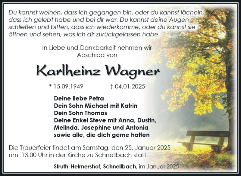 Hier finden Sie alle Traueranzeigen aus der Zeitung, die bisher für Karlheinz Wagner erschienen sind. Weitere Traueranzeigen, die in der Zeitung erscheinen, werden hier ebenfalls aufgelistet