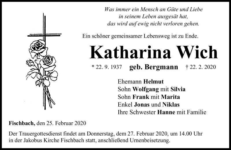 Hier finden Sie alle Traueranzeigen aus der Zeitung, die bisher für Katharina Wich erschienen sind. Weitere Traueranzeigen, die in der Zeitung erscheinen, werden hier ebenfalls aufgelistet