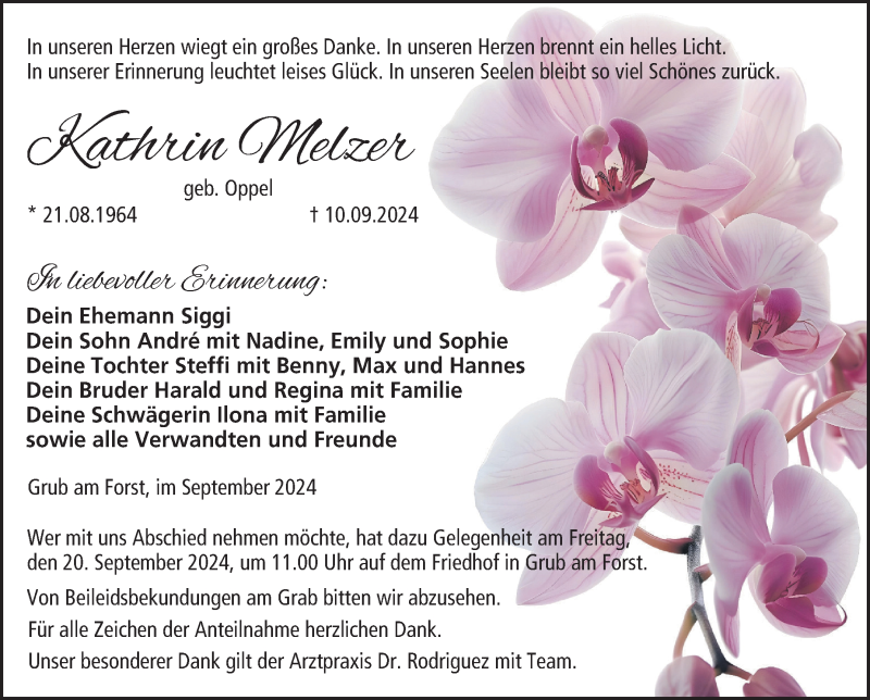 Hier finden Sie alle Traueranzeigen aus der Zeitung, die bisher für Kathrin Melzer erschienen sind. Weitere Traueranzeigen, die in der Zeitung erscheinen, werden hier ebenfalls aufgelistet