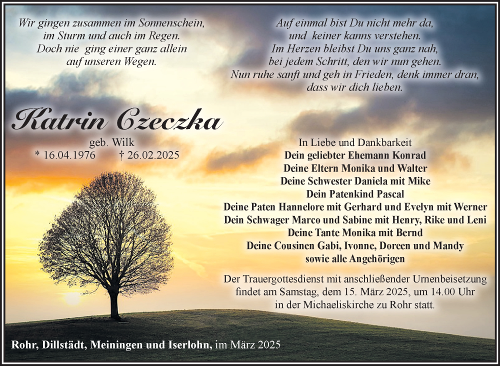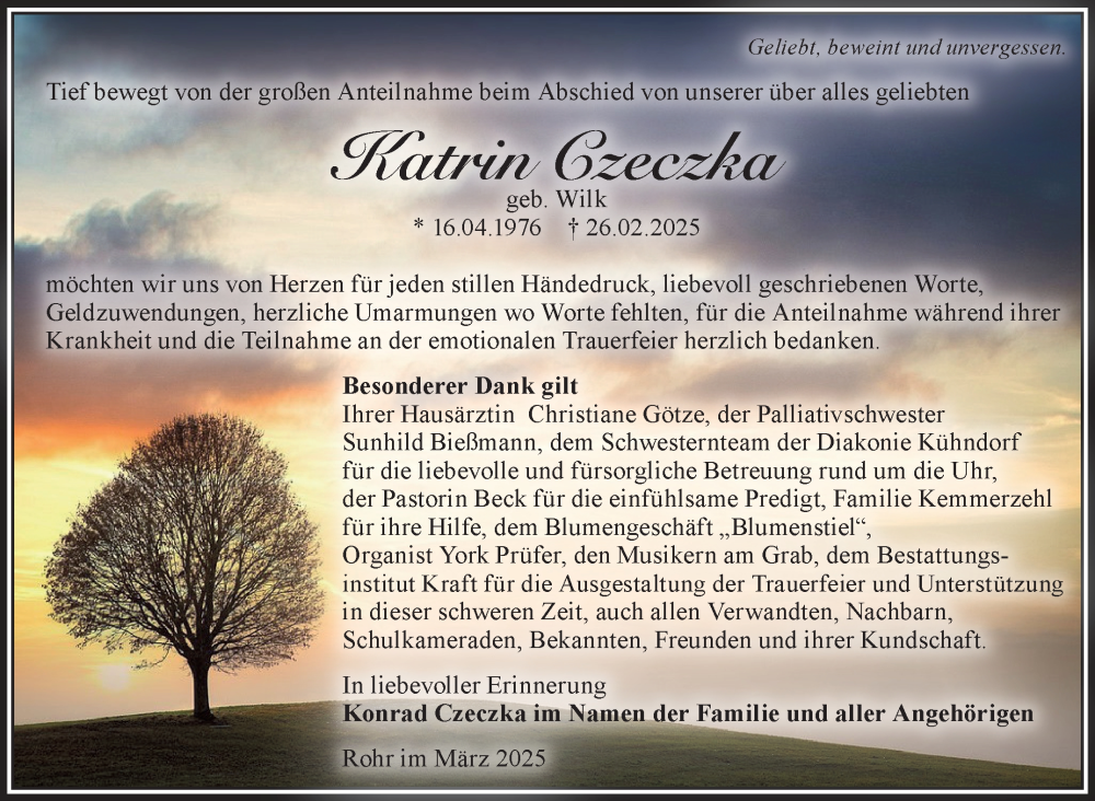Hier finden Sie alle Traueranzeigen aus der Zeitung, die bisher für Katrin Czeczka erschienen sind. Weitere Traueranzeigen, die in der Zeitung erscheinen, werden hier ebenfalls aufgelistet