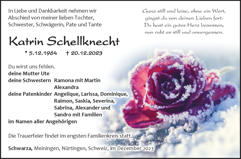 Hier finden Sie alle Traueranzeigen aus der Zeitung, die bisher für Katrin Schellknecht erschienen sind. Weitere Traueranzeigen, die in der Zeitung erscheinen, werden hier ebenfalls aufgelistet