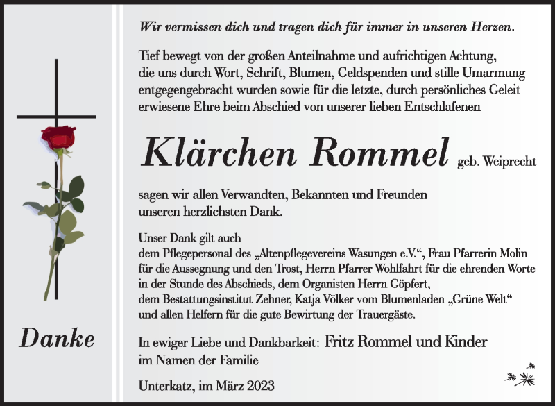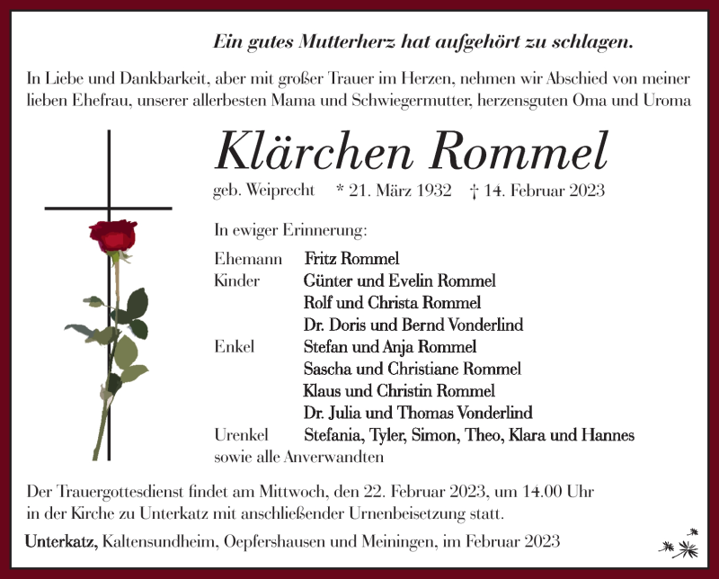 Hier finden Sie alle Traueranzeigen aus der Zeitung, die bisher für Klärchen Rommel erschienen sind. Weitere Traueranzeigen, die in der Zeitung erscheinen, werden hier ebenfalls aufgelistet