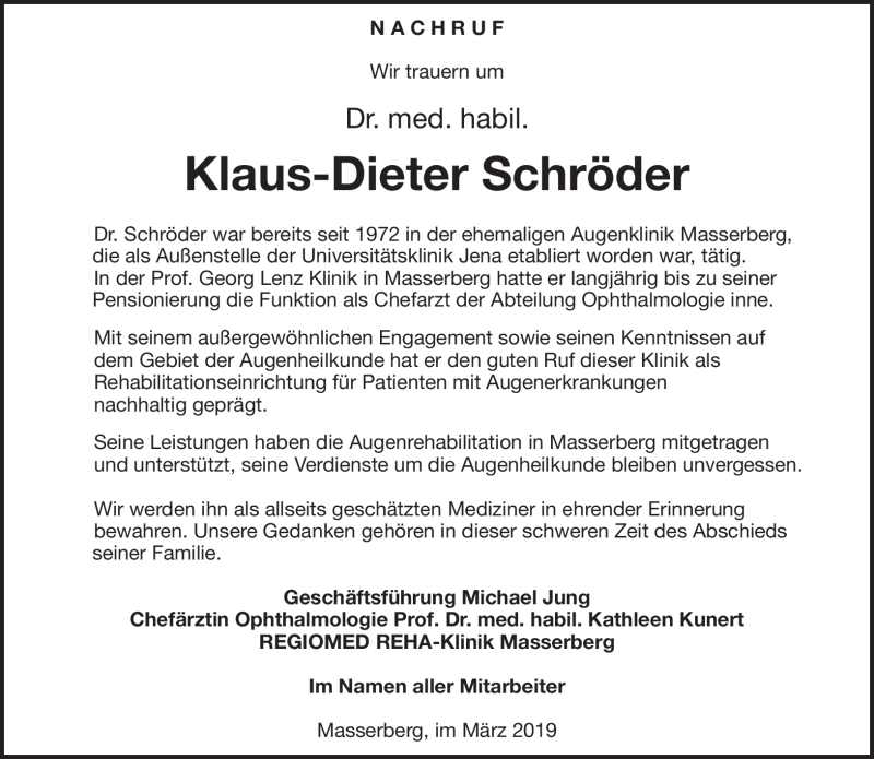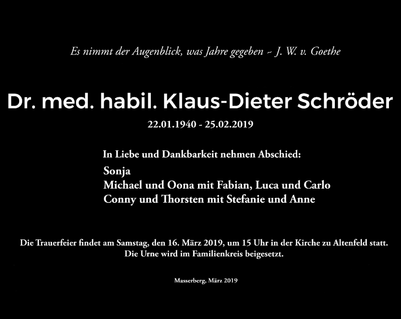 Hier finden Sie alle Traueranzeigen aus der Zeitung, die bisher für Klaus-Dieter Schröder erschienen sind. Weitere Traueranzeigen, die in der Zeitung erscheinen, werden hier ebenfalls aufgelistet