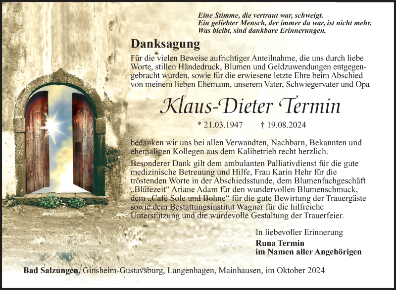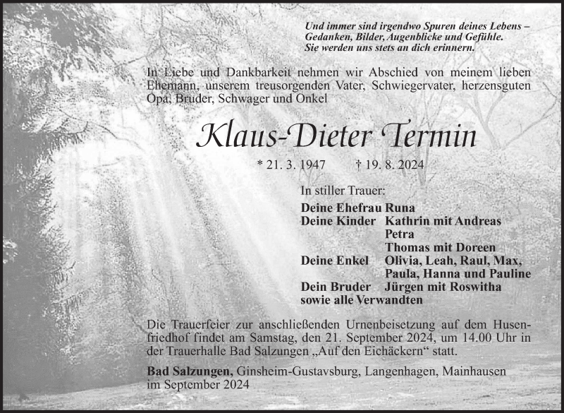 Hier finden Sie alle Traueranzeigen aus der Zeitung, die bisher für Klaus-Dieter Termin erschienen sind. Weitere Traueranzeigen, die in der Zeitung erscheinen, werden hier ebenfalls aufgelistet